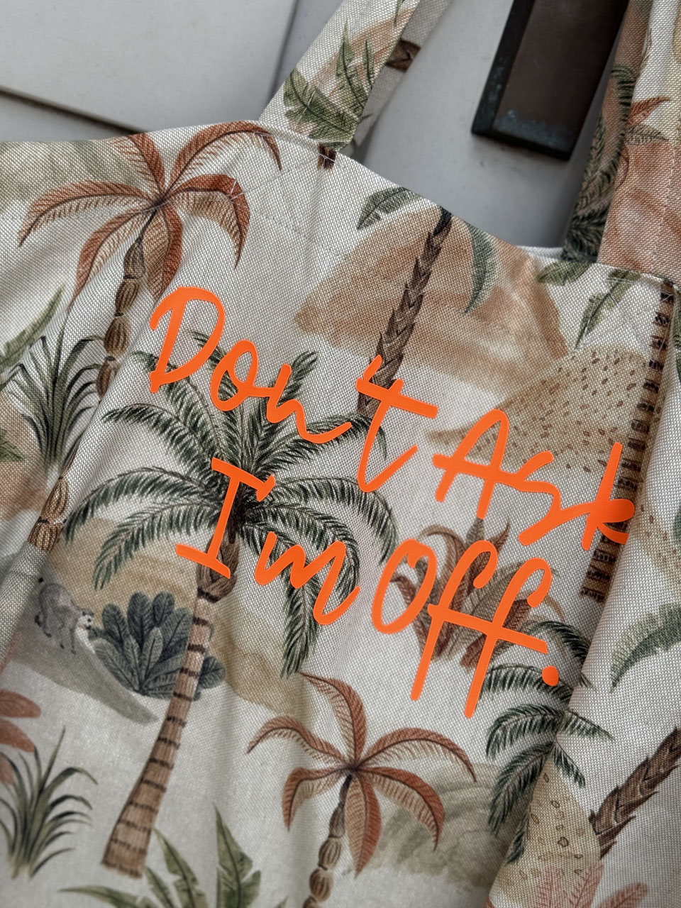 Unsere BIGBAG aus festem Baumwollstoff mit dem tropischem Palmenprint, allerdings mit coolem Statement Don't Ask! I'm Off! (3D Schrift, neonorange).